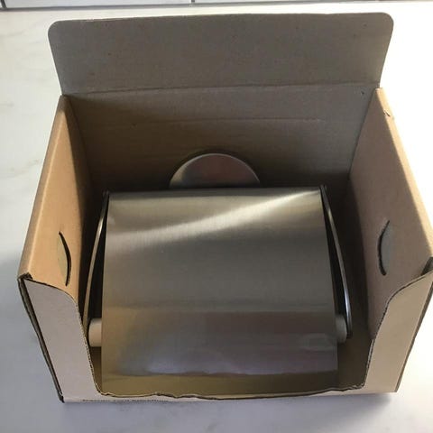 Toalettpappershållare i ”borstat stål” utseende som vi byter när vi renoverat vår toalett.