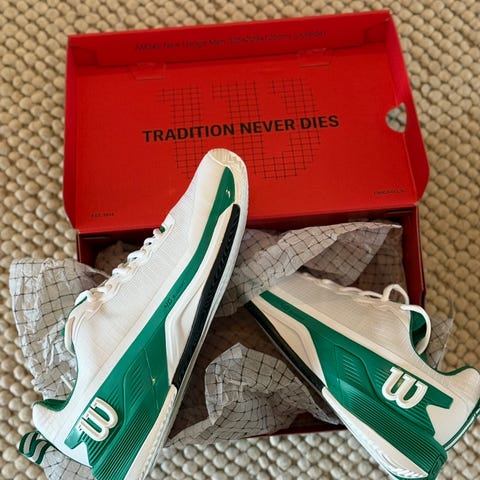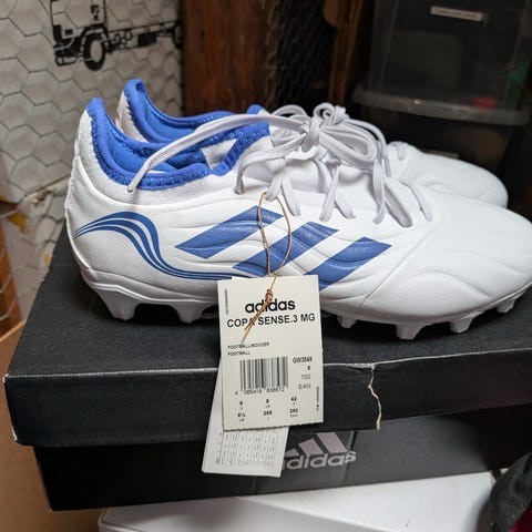 Adidas Superstar träningsskor i storlek 42. Skorna är vita med gröna detaljer och har en klassisk design med tre ränder på sidan. Passar för träning och vardagligt bruk.