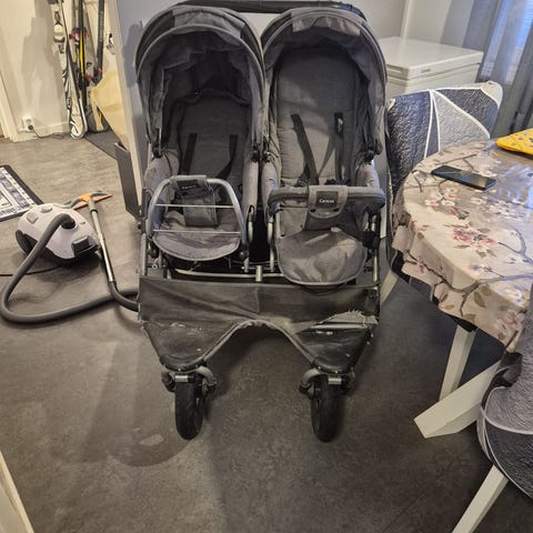 Rejäl och enkel syskonvagn. Använd men välvårdad. Har förvarats i carport sommartid och i varmt förråd vintertid. Ryggdelen går att fälla ner till plant läge samt att det följer med en liggdel för bäbis. Perfekt vagn för växande barn. Justerbart handtag och punkteringsfria däck. Suffletten är stor och vagnen är både rymlig för barn men smidig för föräldern.