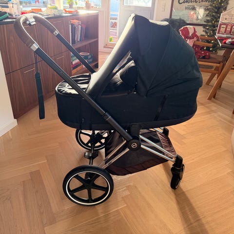 CYBEX barnvagn i svart färg. Barnvagnen har tre hjul med vita kanter och en sufflett med nät för ventilation. Den är utrustad med säkerhetsbälte och är anpassad för barn.