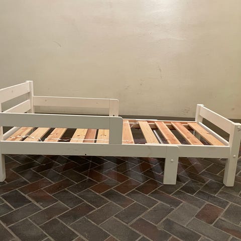 Växa-säng/barnsäng, madrass 80 cm bred i två delar 115 cm och 75 cm (ingår om så önskas). 190 cm maxlängd. Skyddsräcke, limmade sprickor i fäste på ena sidan.