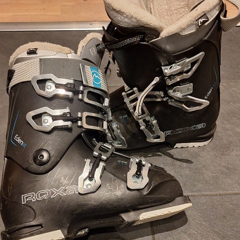 Atomic skidpjäxor i röd och svart färg, storlek 28.5. Pjäxorna har fyra spännen i metall för justerbar passform och en rem runt vristen.