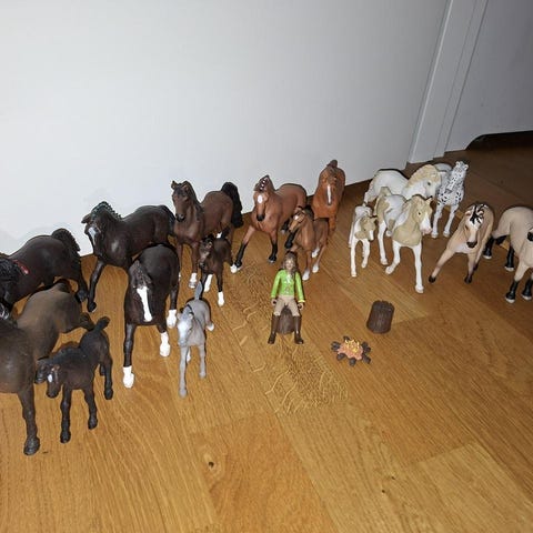 Schleich hästar, husdjur, ryttare, tillbehör, stall, cafè, bil, hästtransport, staket och massa mer saker (allt är inte med i bild). Finns i Västerås men kan levereras mellan Stockholm och Örebro. Plastlådor till förvaring ingår.