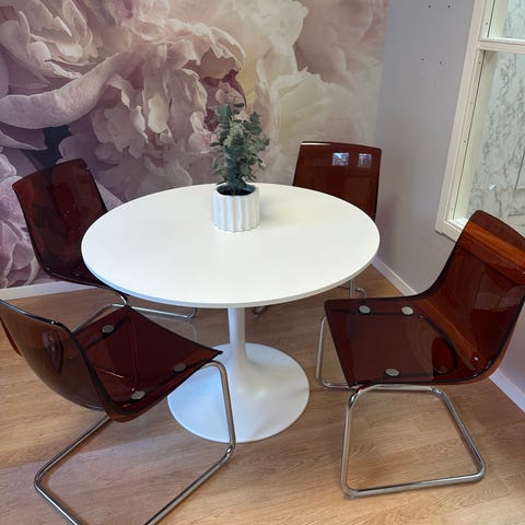 Säljer 4 st jättefina kontorsstolar i en djup plommonlila färg. Har stått på ett hemmakontor och använts mycket sparsamt. Inga synliga fläckar eller slitage. Höj och sänkbara.