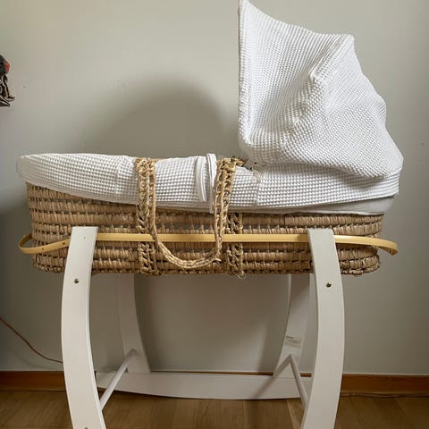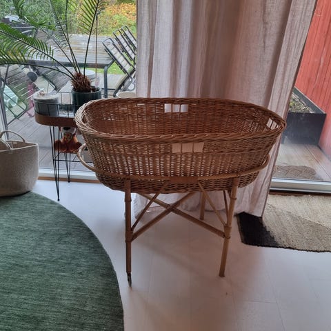 Superfin moseskorg med gungstativ i mycket fint skick. I moseskorgen ingår madrass och täcke. Allt är såklart tvättat. Nypris 1 848 kr.