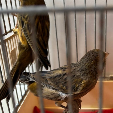 Ett par kanariefåglar. Hane 7 månader redo för avel. Hona 4 månader.