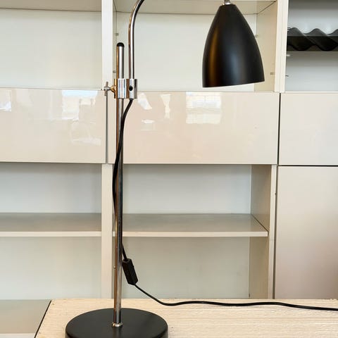 En bordslampa med justerbar arm i mässing. Lampan har en rund fot och en skärm i metall. Tillverkad av Watt & Veke