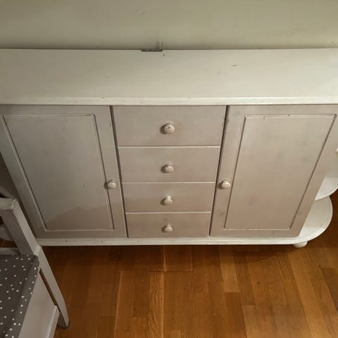 Säljer en fin och stabil skänk i grått, perfekt som köksmöbel eller hallmöbel eller planteringsbord för den som gillar att hålla på med växter.