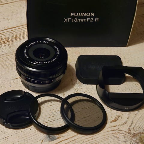 Säljer nu mitt fina exemplar av Fujifilms objektiv Fujinon XF 35mm F1.4 R. Reglagen löper felfritt och glas fram/bak är felfria. Följer med ett UV-filter. Objektivet är i fint skick och har enbart några få skavanker varav den tydligaste syns närmare på en av bilderna. En skarp kompakt glugg med underbar bokeh - klassiker. Kommer i originalkartongen med original motljusskydd med gummilock samt förvaringspåsen i tyg.