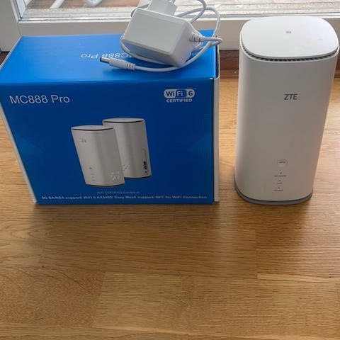 ZTE Router med nätverksanslutning för internetuppkoppling. Enheten är vit och har portar för nätverkskablar på baksidan. Strömadapter medföljer.