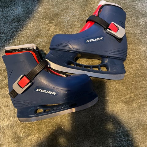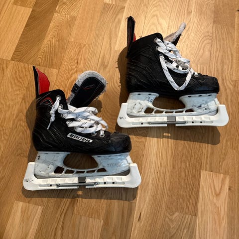 Bauer ishockeyskridskor i barnstorlek 29. Skridskorna är svarta och anpassade för ishockeysporten. De är utformade för att ge stöd och komfort vid spel och träning på is.