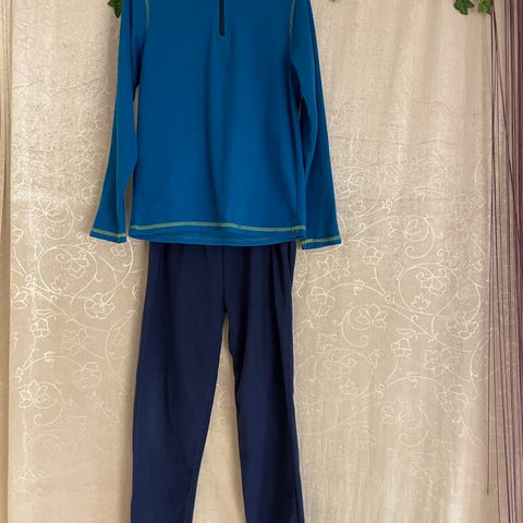 Ett mycket fint lite tunnare fleeceset med en cerises half zip tröja och lila byxor med gummiband i midjan och benslut.