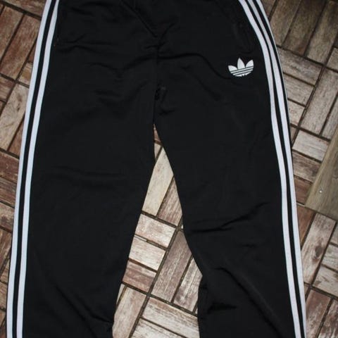 Ett par svarta Adidas shorts med vita ränder och klassisk Adidas logga och fickor med dragkedja.