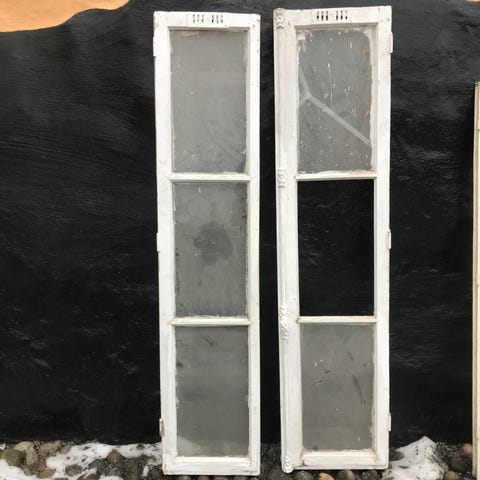 Antikt dubbelfönster hemkånkat från Paris. 1880-tal, Hausmannien-stil/Belle Époque. Tillverkat av ek med ornamenterat crémone-handtag av gjutjärn (väldigt vackert om man tar bort färgen). Kan bli tjusiga dörrar till ett skåp. Bra skick.
