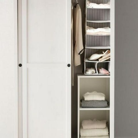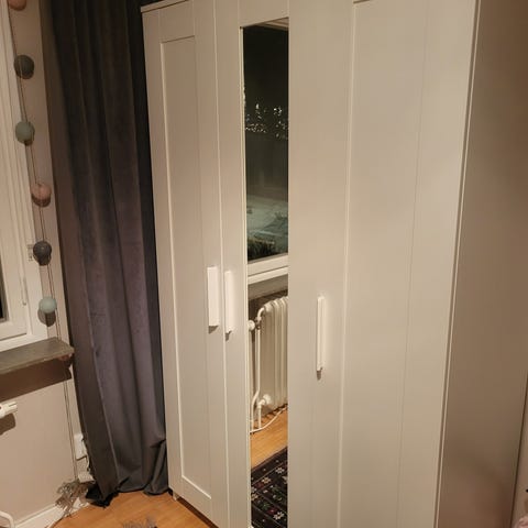 garderob med speglar på insida dörrar, hylla, klädstång och en låda