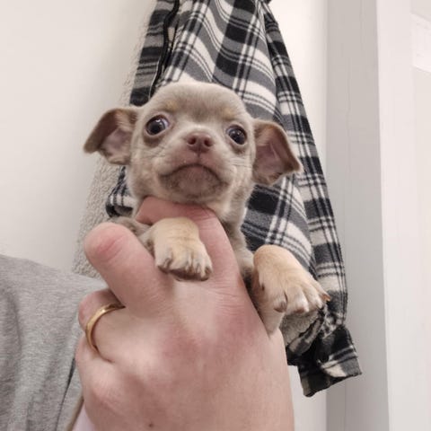 Gråblå kort päls. Liten sällskapshund som vuxen max ca 2.5 kg.