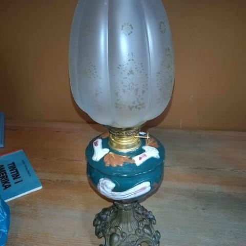 Oljelampa med bas i glas och metall samt vit skärm. Lampan har en dekorativ metallfot och en rund glasdel under skärmen. Passar för bordsplacering i hemmet.