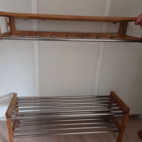 Hatthylla i ek med två hyllor och krokar längst ner. Solid och stabil. Osäker på varumärke.