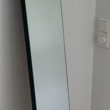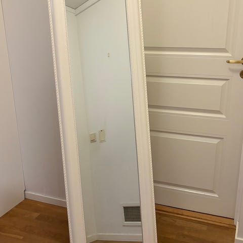 Stylish full-body floor mirror with sleek gray/silver metal frame and sturdy light wood triangular stand. 165 cm tall and 50 cm wide. New retail price ~1500 kr.