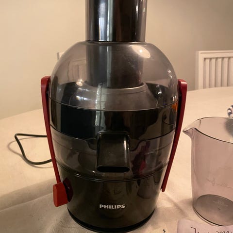 Philips juicemaskin i metall och plast med elanslutning. Används för att pressa juice från frukt och grönsaker.