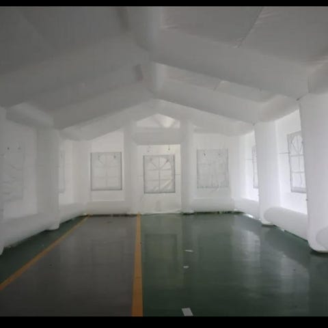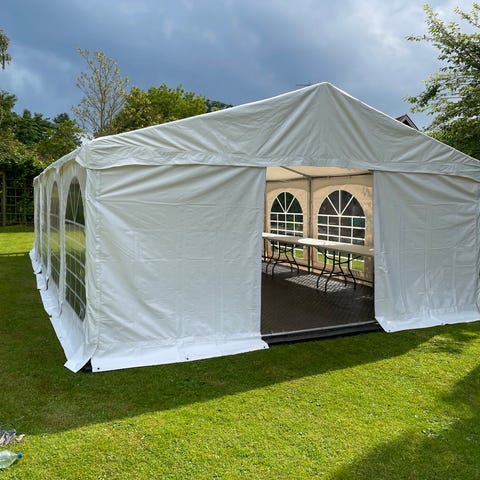 Partytält med måtten 4 x 8 meter och totalhöjd 3 meter. Tältet är vitt.