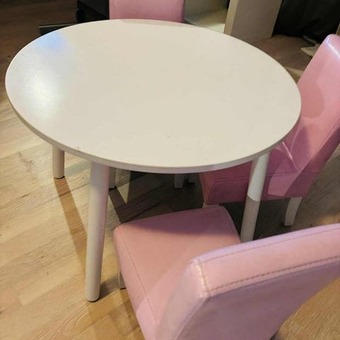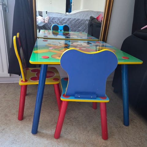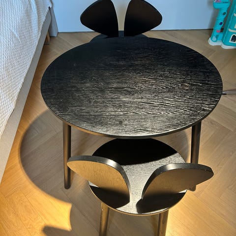 Muumi Barnmöbler Set bestående av ett bord och två stolar i blå färg. Möbelsetet är anpassat för barn och passar för olika aktiviteter som lek,pyssel och måltider.