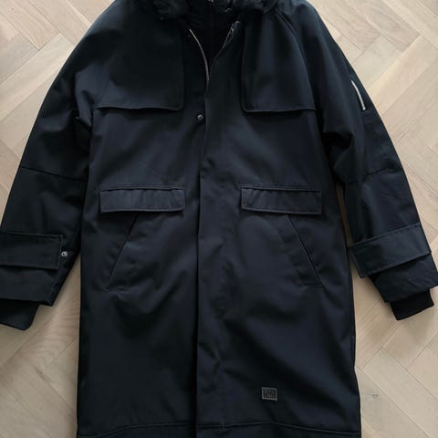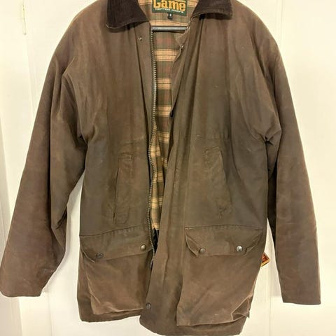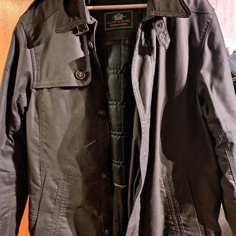 Brixtol oljerock/jacka i mycket gott skick, vaxad bomull. Storlek L och har burits (mycket sparsamt) av mig som är 185 cm lång och smal.