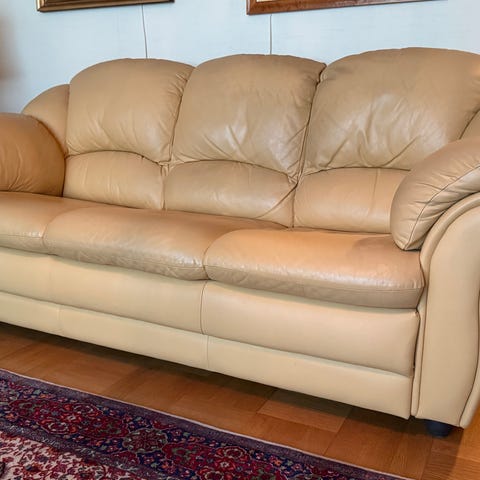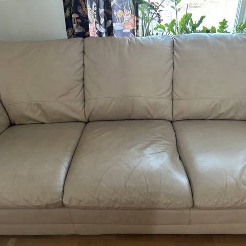 Beige lädersoffa med plats för tre personer. Soffan har en mjuk och slät yta i lädermaterial och är lämplig för vardagsrum eller liknande utrymmen.