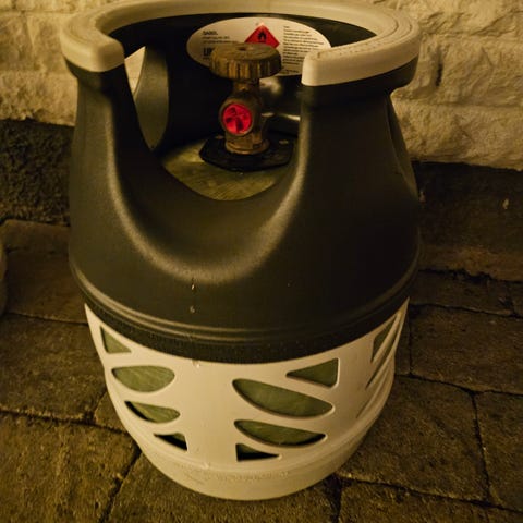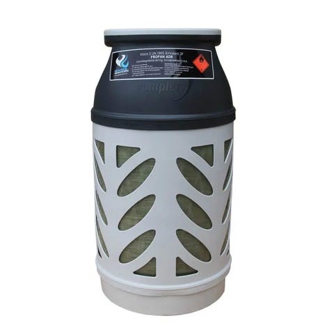 2st halvfulla Ragasco Gasflaska Komposit med kapacitet på 5 kg, i färgerna grå och vit. Flaskan är tillverkad i kompositmaterial, vilket gör den lättare än traditionella metallflaskor. Passar för användning i olika gasapplikationer där en portabel och säker gasbehållare behövs.