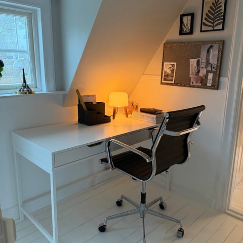 Stilrent skrivbord i snygg blå färg. Två lådor för förvaring och praktiskt fack för sladdar.