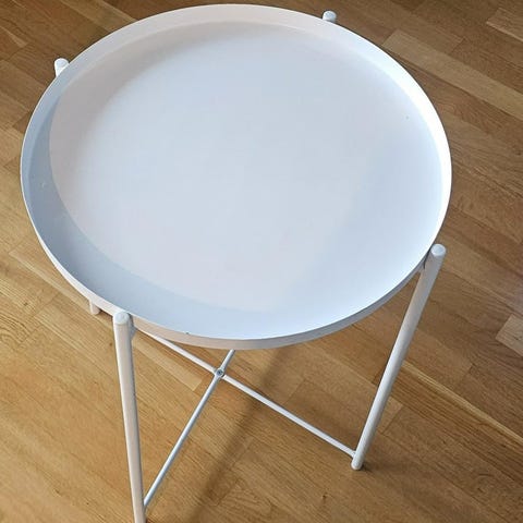 Brickbord köpt på Tibergs möbler. Ekben och vit bricka. Spricka i brickan. Men den kan man ju byta