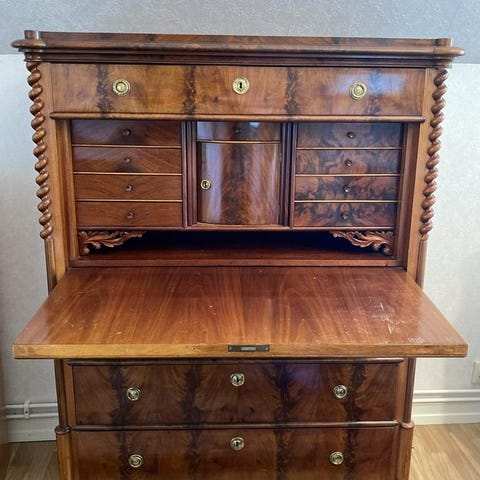 Chiffonjé i ek från ca 1880- talet med flera små lådor och en utdragbar skrivyta.