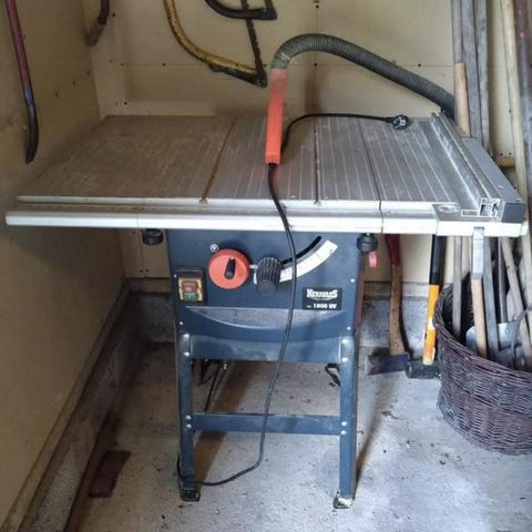 Bordssåg med justerbar vinkel och skydd för sågblad. Utrustad med strömkabel och stabil arbetsyta. Passar för träbearbetning och andra sågrelaterade uppgifter.