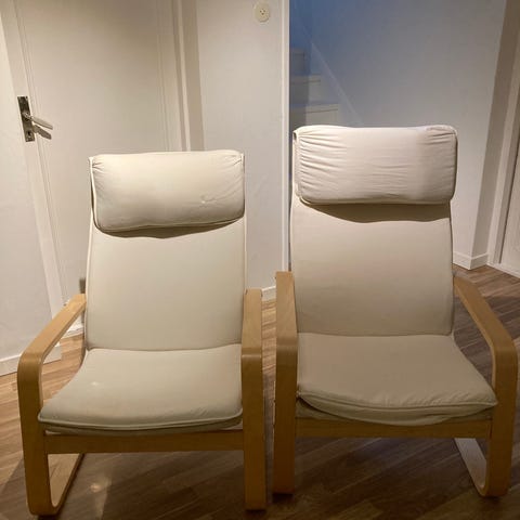 2 fåtöljer säljes, en fotpall samt nya dynor (se bild). Fåtöljerna är i fint använt skick.