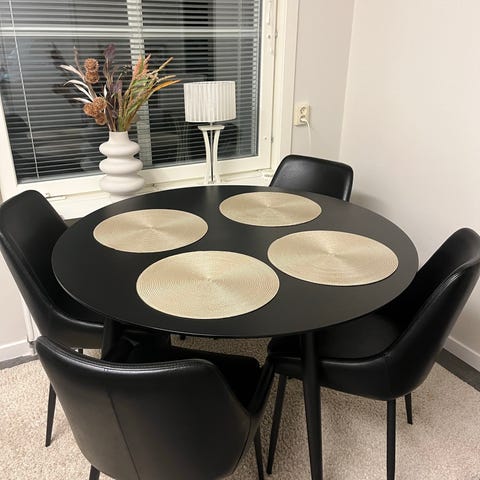 Matgrupp bestående av ett runt bord med marmorskiva och metallbas samt fyra stolar. Stolarna har dekorativa lejonhuvuden med ringar på ryggstödet. Passar för matrum eller kök.