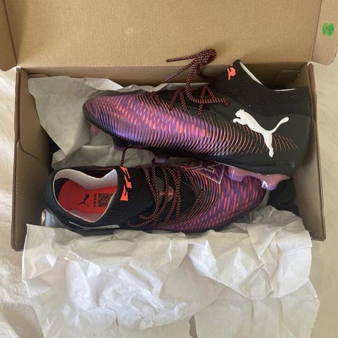 Puma Future Z 1.3 FG/AG fotbollsskor i storlek 41. Skorna är vita med detaljer i Luminous Blue och rosa. Designade för användning på fasta och konstgräsunderlag.