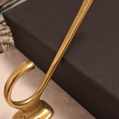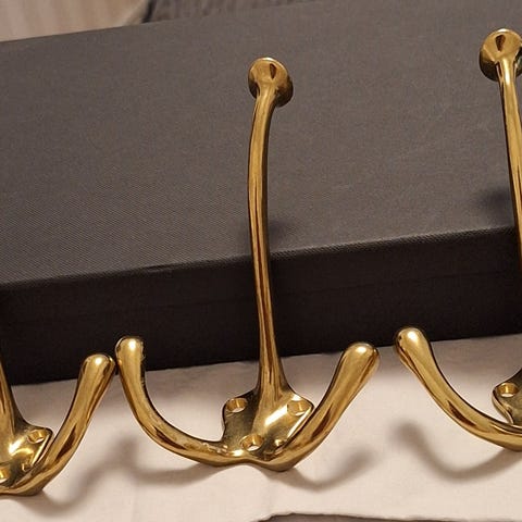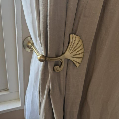 Säljer sex eleganta och rejält tilltagna omtagskrokar i mässing. Perfekta för att skapa ett klassiskt och stilfullt fall på gardinerna.