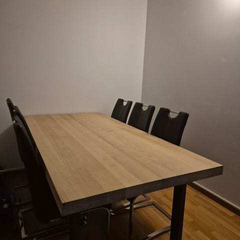 Mio matbord i ljust trä med vita ben. Bordet har en ljus träyta och är designat för användning i matsal eller kök. Säljs idag nytt på Mio för cirka 40 000. Sex stolar medföljer varav fyra syns på bilden.