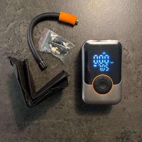 Tryckluftspumpen har 5 förinställda program; ett användarinställt och dessutom ett till bil, ett till motorcykel, ett till cykel och ett till basketbollar och liknande.