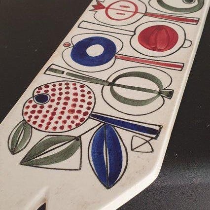 Rörstrand skärbräda i keramik med blommotiv i blått, rött och grönt. Plattan är avlång med ett hål för upphängning och kan användas som dekorativ väggdekoration.
