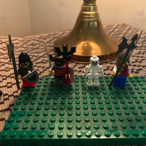 Det saknas två figurer, en brun tunna, ett vitt horn, ett genomskinligt glas, två eldflammor, delar till vagnen, en del tillbehör som vapen, hatt, trumpet, sadel.