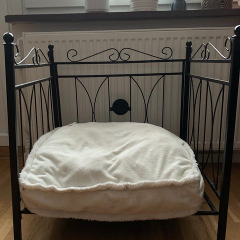Sängen har en stabil ram med hörnfästen i svart material. Passar som sovplats för stor hund som schäfer eller golden.
