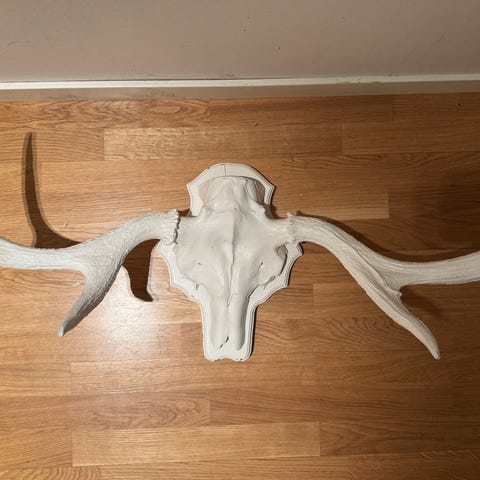 Älghorn med skalle på träplatta