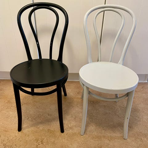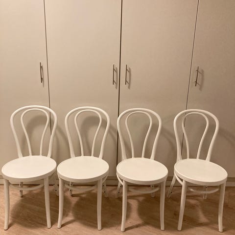 4 st svarta Öglan från Ikea. Tillverkade 2010. Något repiga, och en av stolarna är limmad på ryggstödet, se bild. Inget som påverkar funktion eller stabilitet. För övrigt bra skick för sin ålder.