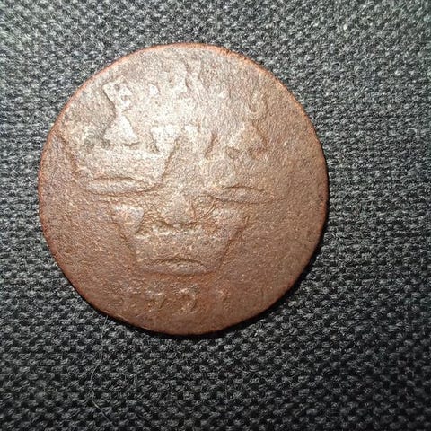 genuine copper 1/3 Skilling Banco coin from the Swedish Empire, dated 1843. This was the final year of production for this specific series under King Karl XIV Johan.