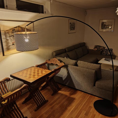 IKEA pilskott golvlampa i svart färg. Lampan har en modern och stilren design med en rektangulär bas och smal pelarform. Passar för allmän belysning i hem eller kontor.