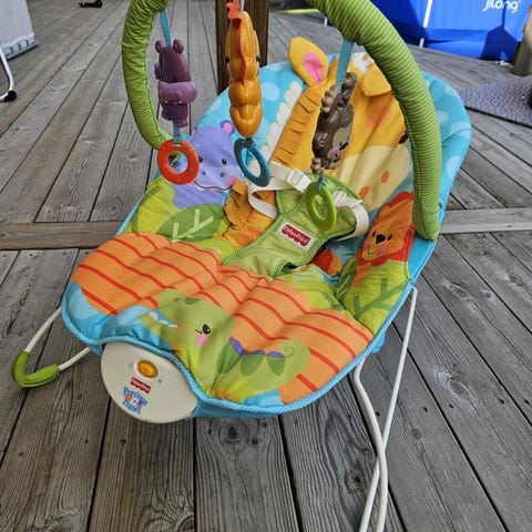 I den här färgglada babysittern med regnskogstema kan barnet leka länge. Den mjuka, avtagbara lekbågen har snurrande löv och löstagbara apor med klapprande pärlor och rullkula. Babysittern vibrerar också på ett lugnande sätt.