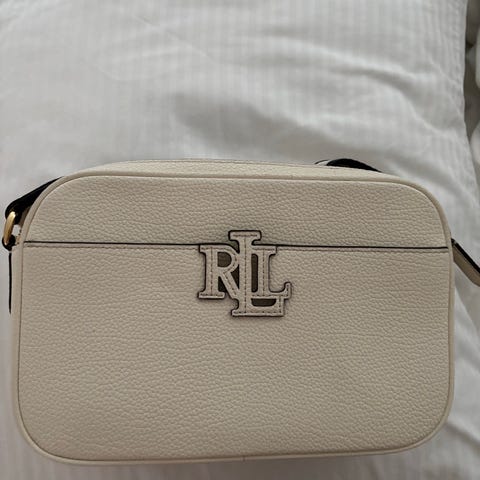 Ralph Lauren handväska i läder för kvinna. Väskan har en strukturerad yta med krokodilmönster och detaljer i guldton. Insidan är fodrad med tyg och innehåller flera fack för organiserad förvaring.