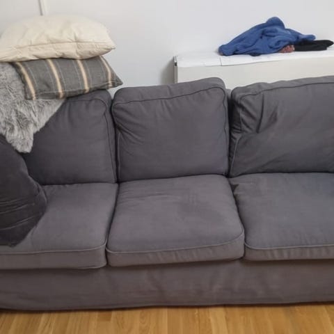 Tresitssoffa Ektorp med ljusgrå klädsel. Fläck på armstöd som säkert går bort i tvätten (Se bild 3)