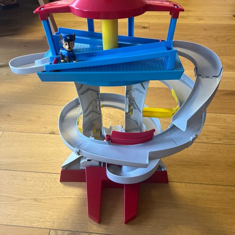 Paw Patrol lekset med rutschkana och tillhörande figurer. Setet innehåller en orange och blå lekplattform med en gul rutschkana, samt figurer som kan placeras på olika delar av leksetet. Materialet är plast och produkten är avsedd för barn. Allt ljud och ljus fungerar.